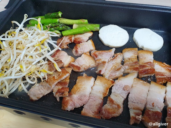 새 쌀로 지은 밥에 삼겹살 척 올려서 맛있게 배통통 저녁 한상 했습니다.
