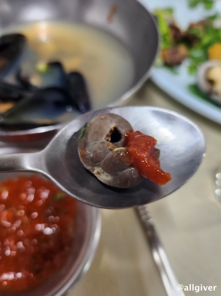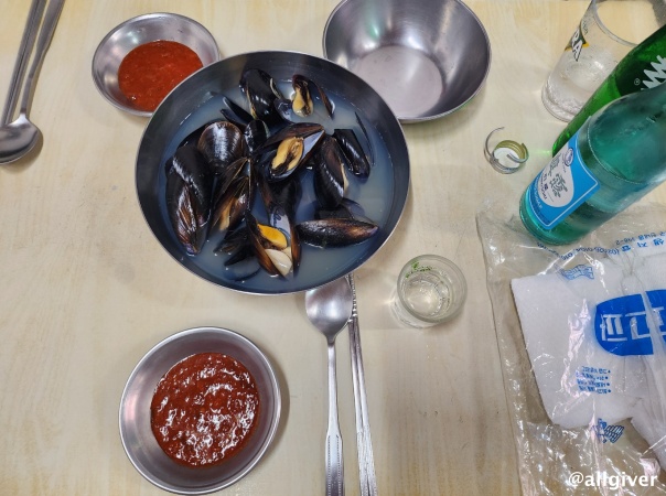 주문한 음식이 나오기 전에 서비스로 홍합탕과